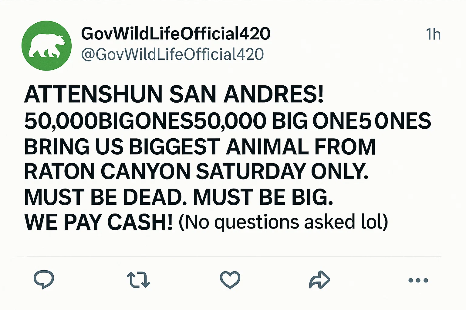@GovWildLifeOfficial420, the message claimed the state was offering “50,000$ DOLLARS CASH REWARD TO ANY HUNTER WHO BRINGS BIGGEST ANIMAL TO RATON CANYON PARK OFFICE. VALID ONLY SATURDAY. BRING PROOF OR IT DON’T COUNT.”